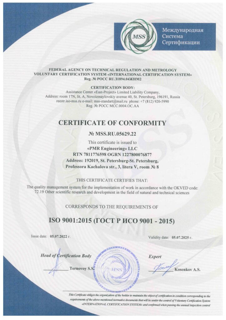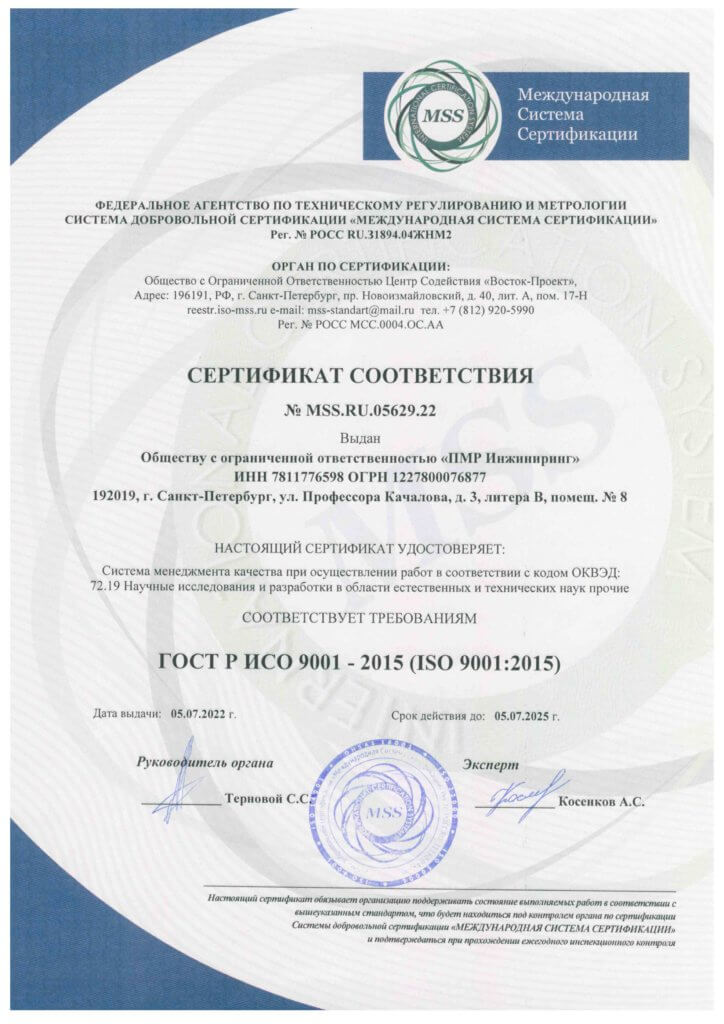 Сертификат соответствия системы менеджмента качества при осуществлении работ требованиям ГОСТ Р ИСО 9001-2015 (ISO 9001:20015).