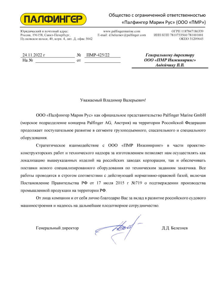 Письмо-благодарность от ООО «Палфингер Марин Рус» за сотрудничество в области локализации оригинального оборудования Palfinger и создания новых образцов судового оборудования.