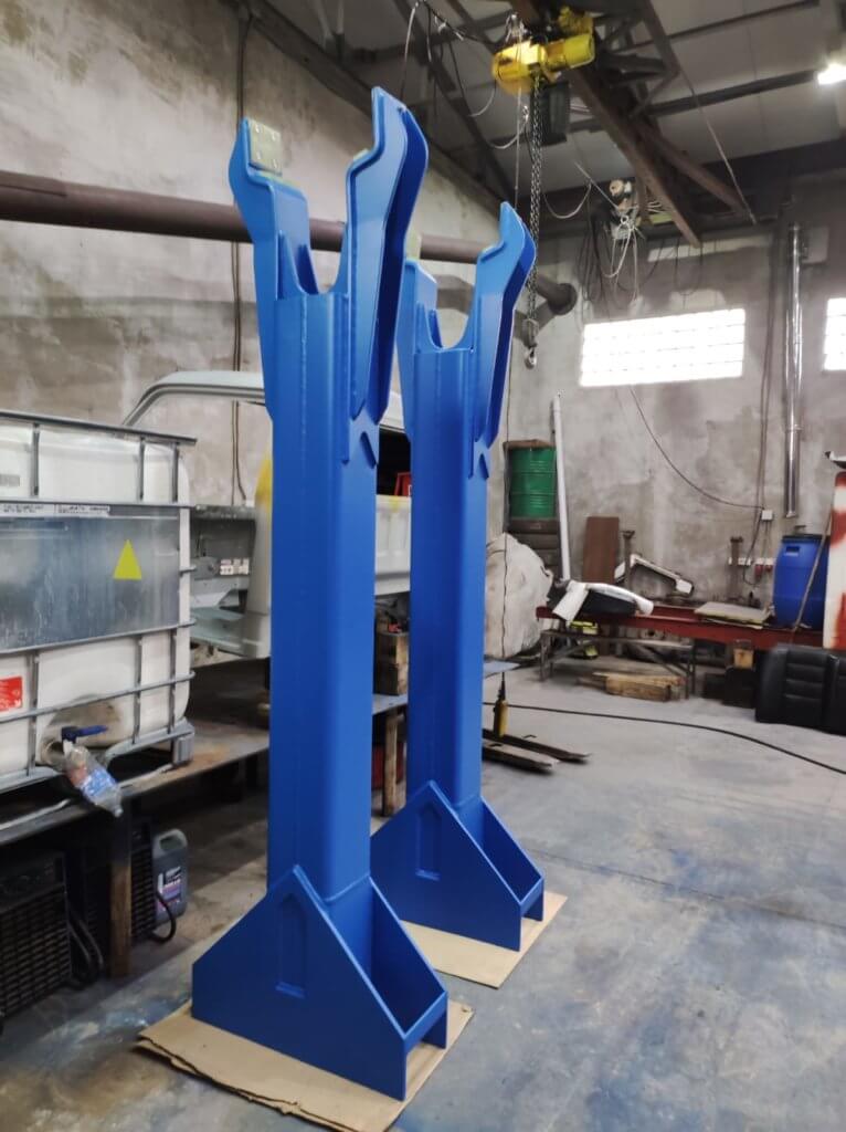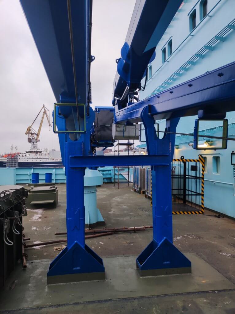 Для комплектации кранов Палфингер, устанавливаемых на ледоколах пр. 22220, разработаны и изготовлены опоры стрел в положении «по-походному». Опоры позволяют снизить нагрузку на элементы металлоконструкций и узлов кранов во время прохождения судна во льдах с повышенной вибрацией, неблагоприятных условий качки с повышенными величинами крена и дифферента судна, а также во время воздействия ветровой нагрузки на стрелы.